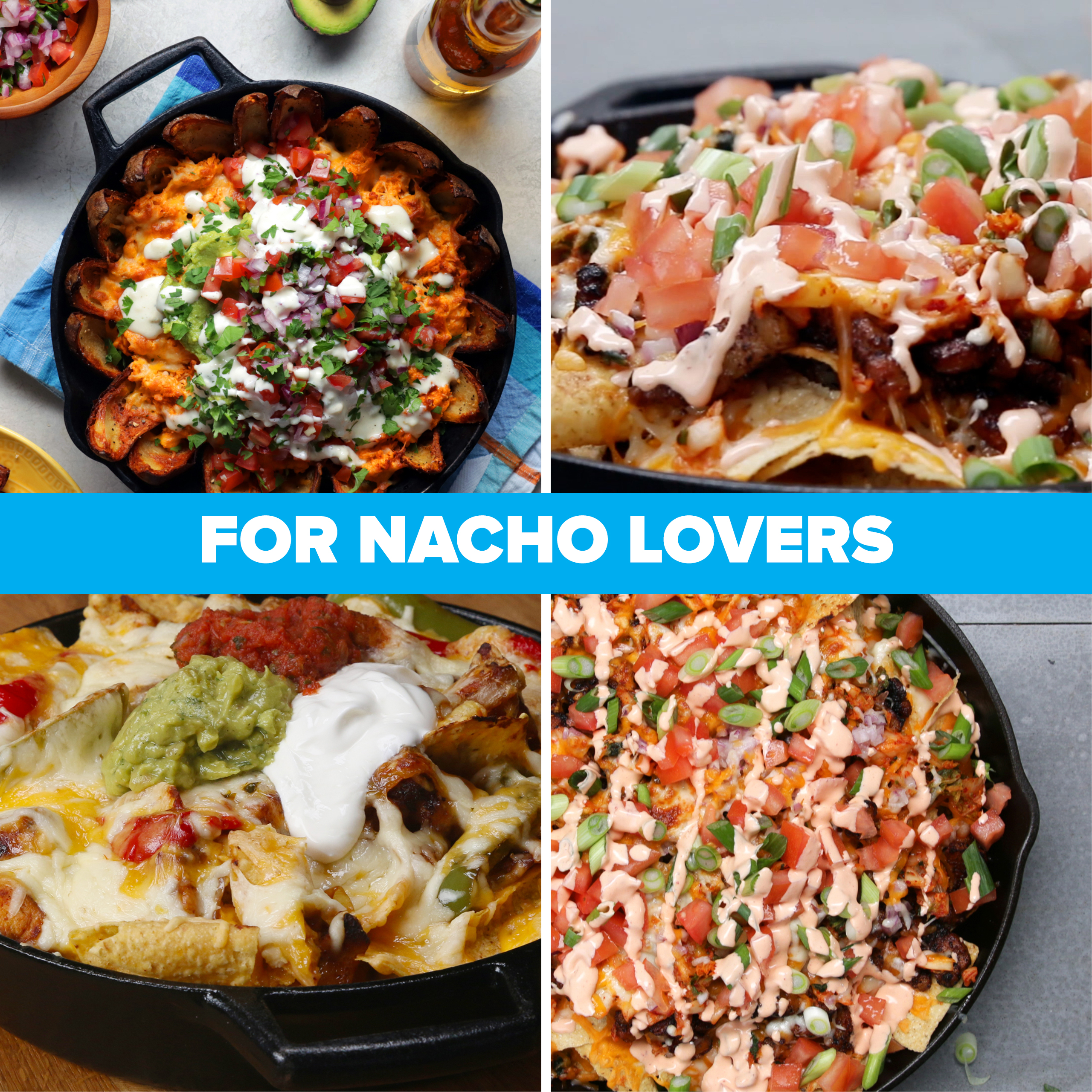 From <a href="https://tasty.co/recipe/loaded-vegetarian-nachos">classic loaded vegetable nachos</a> to juicy <a href="https://tasty.co/recipe/steak-fajita-nachos">steak fajita nachos</a>, these versatile nacho recipes are equally impressive, delicious, and easier to make than you think. Share them with your friends and family, or keep them to yourself entirely! It's never a bad time to nacho — trust us on that one.